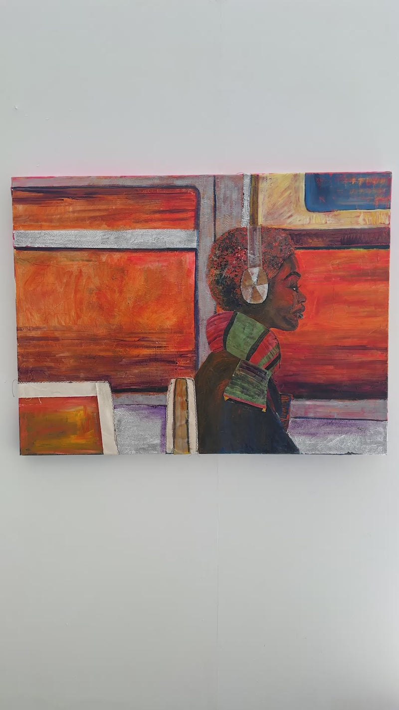 sewn materials, oil, acrylic, aerosol, aluminum, canvas and tissue paper on canvas