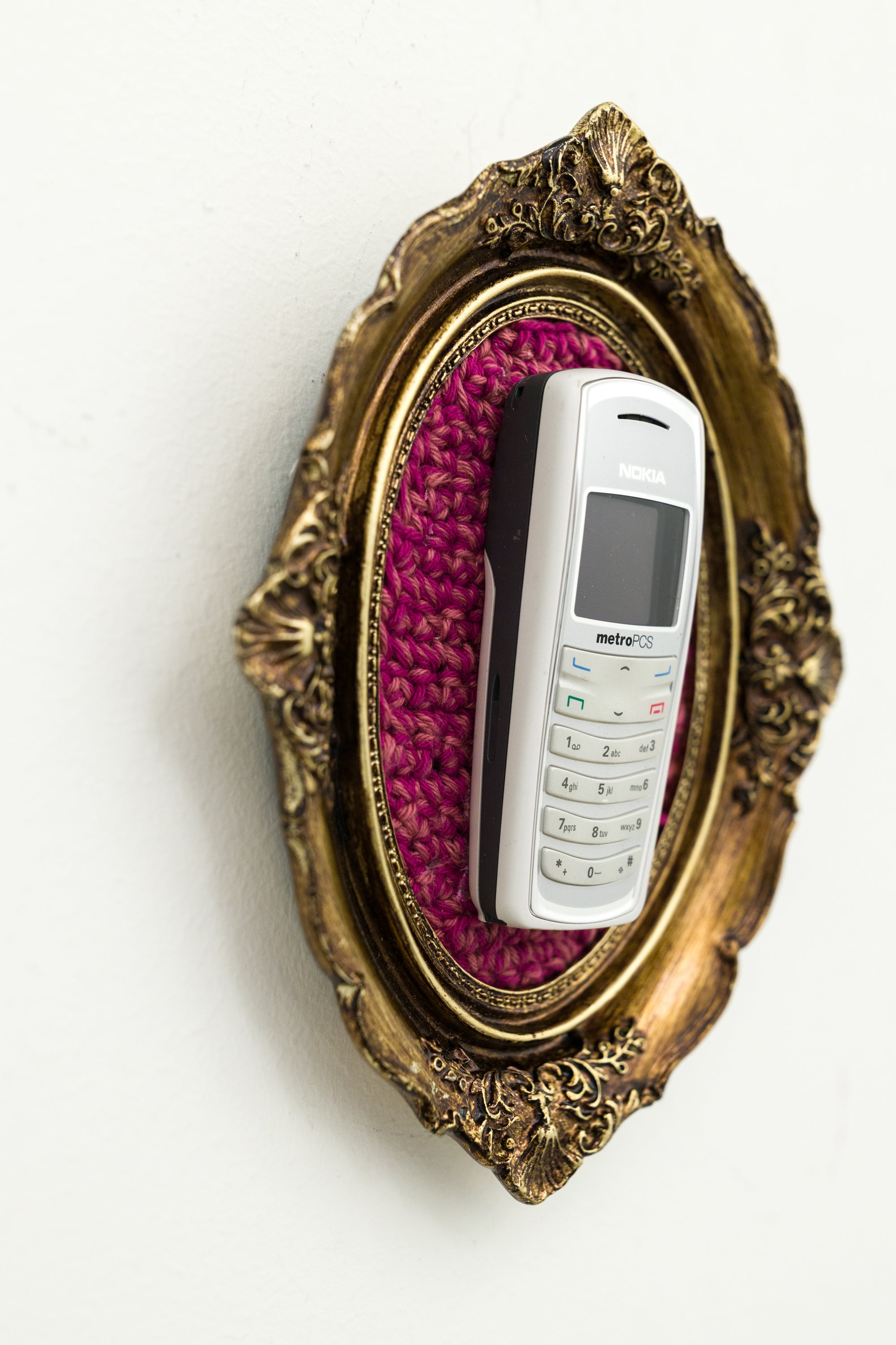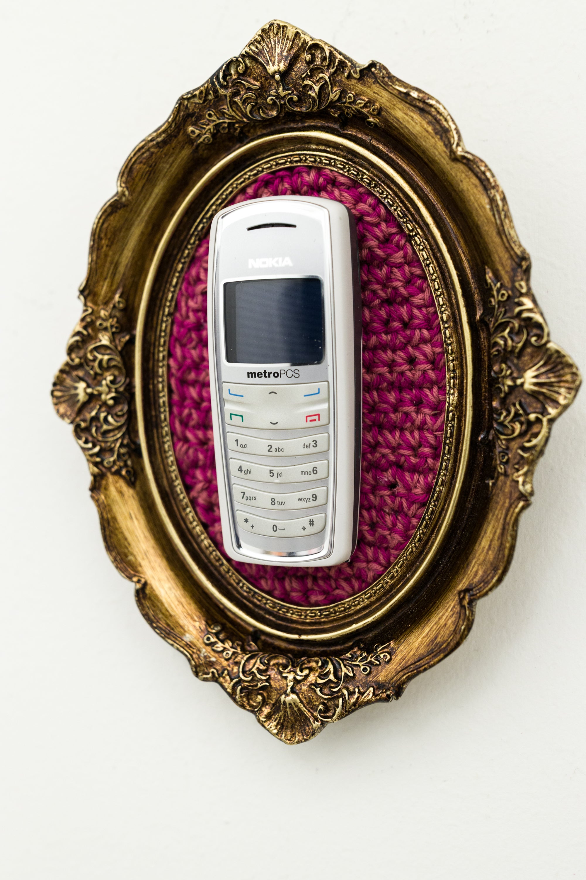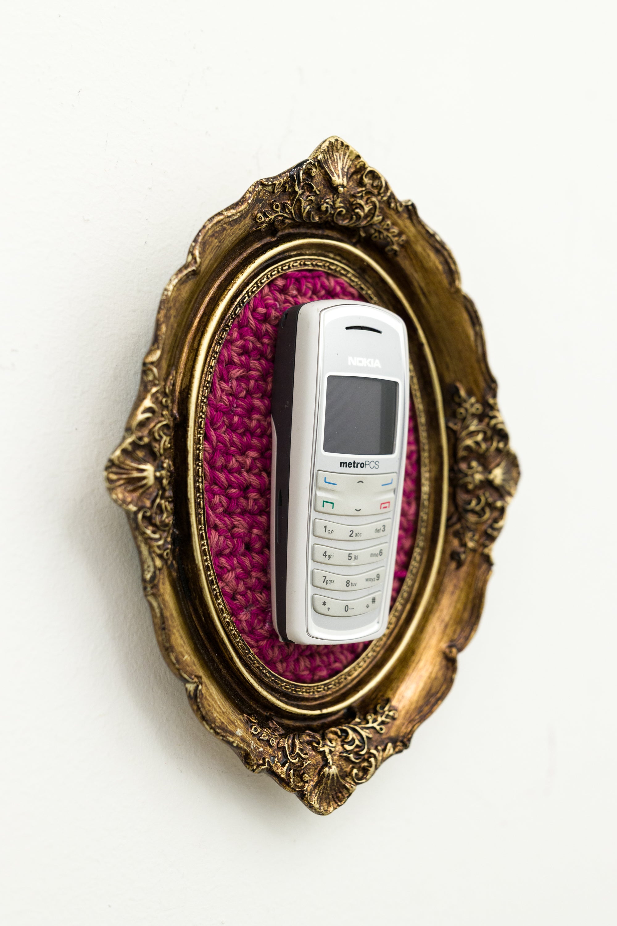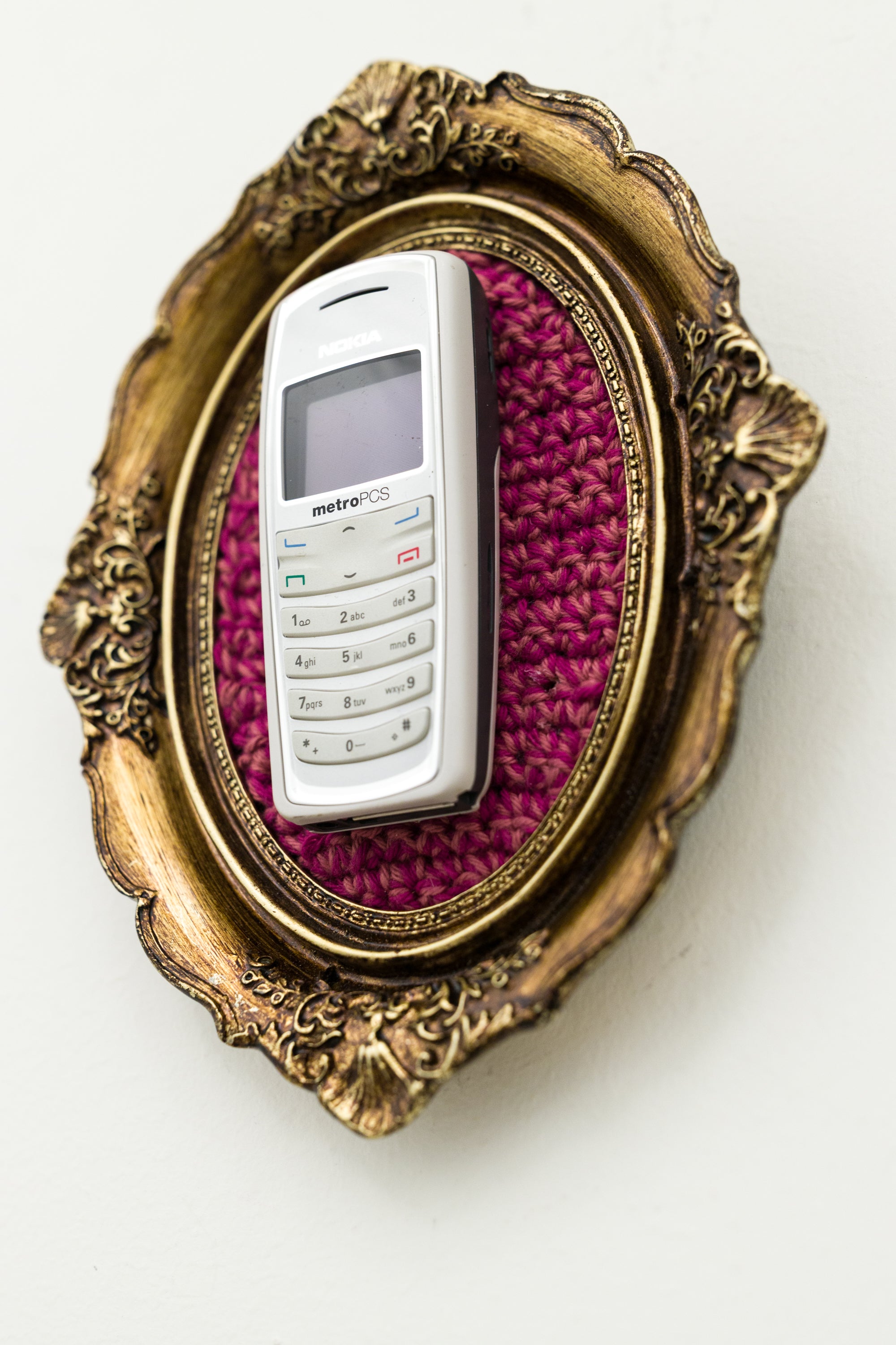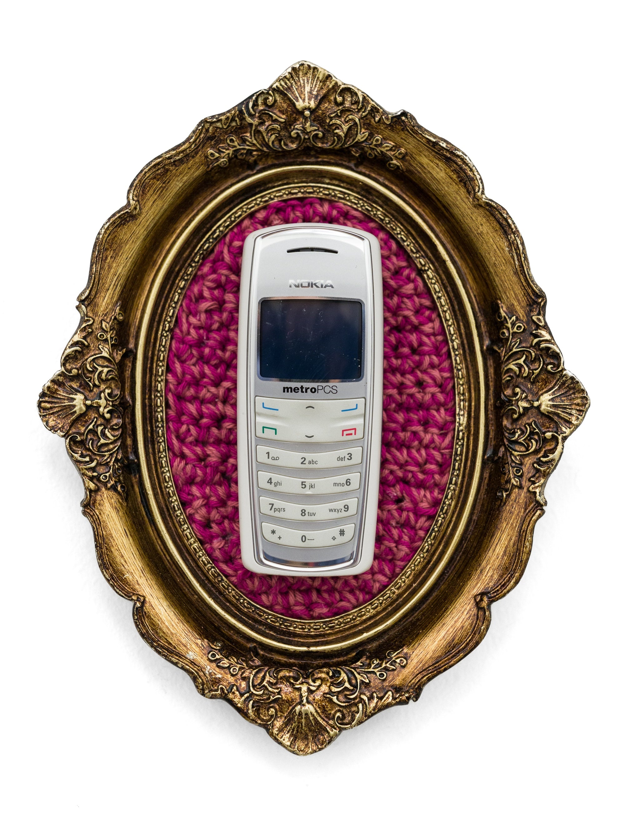 recycled cell phone mounted on crocheted acrylic in ornate frame