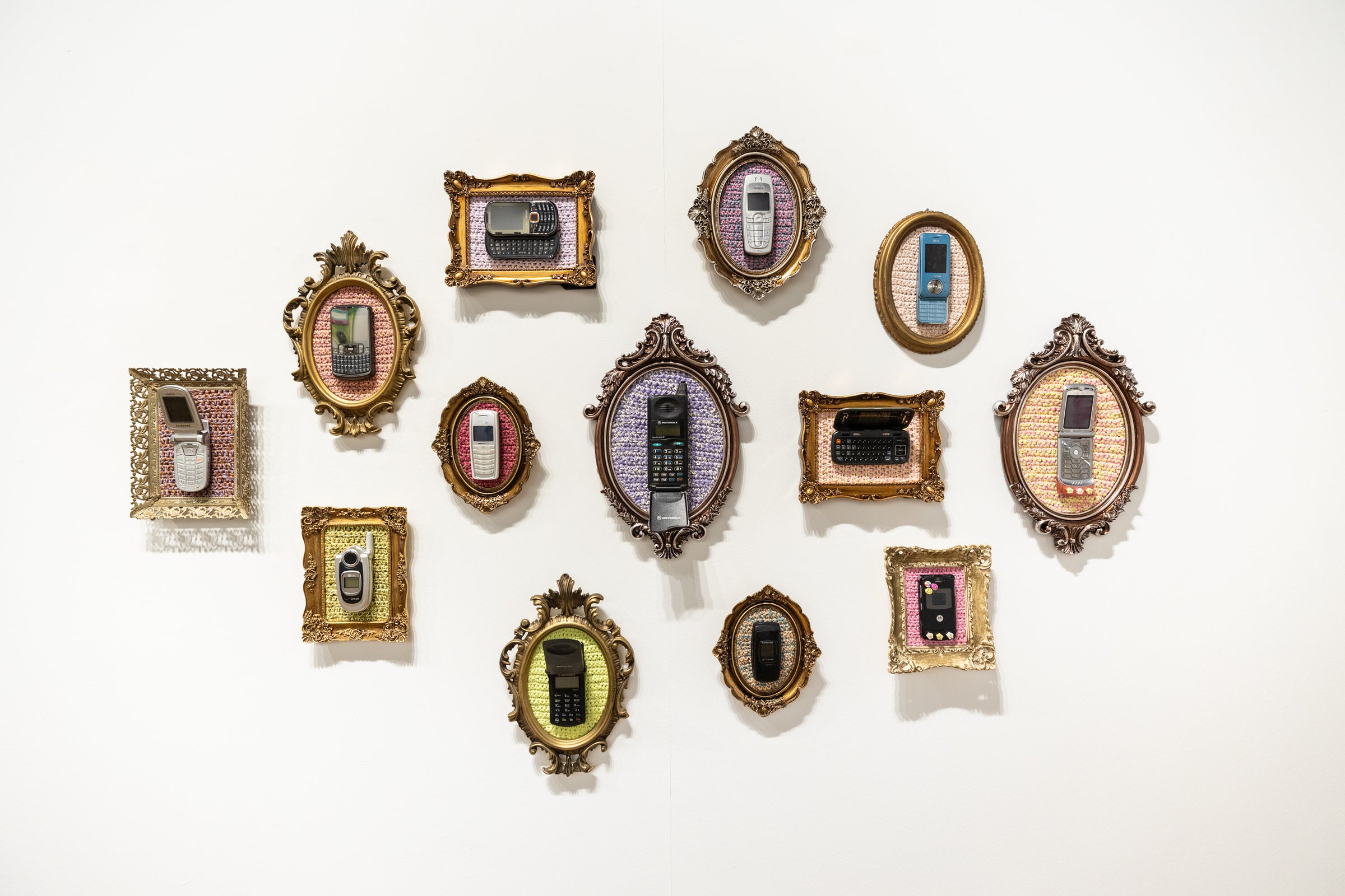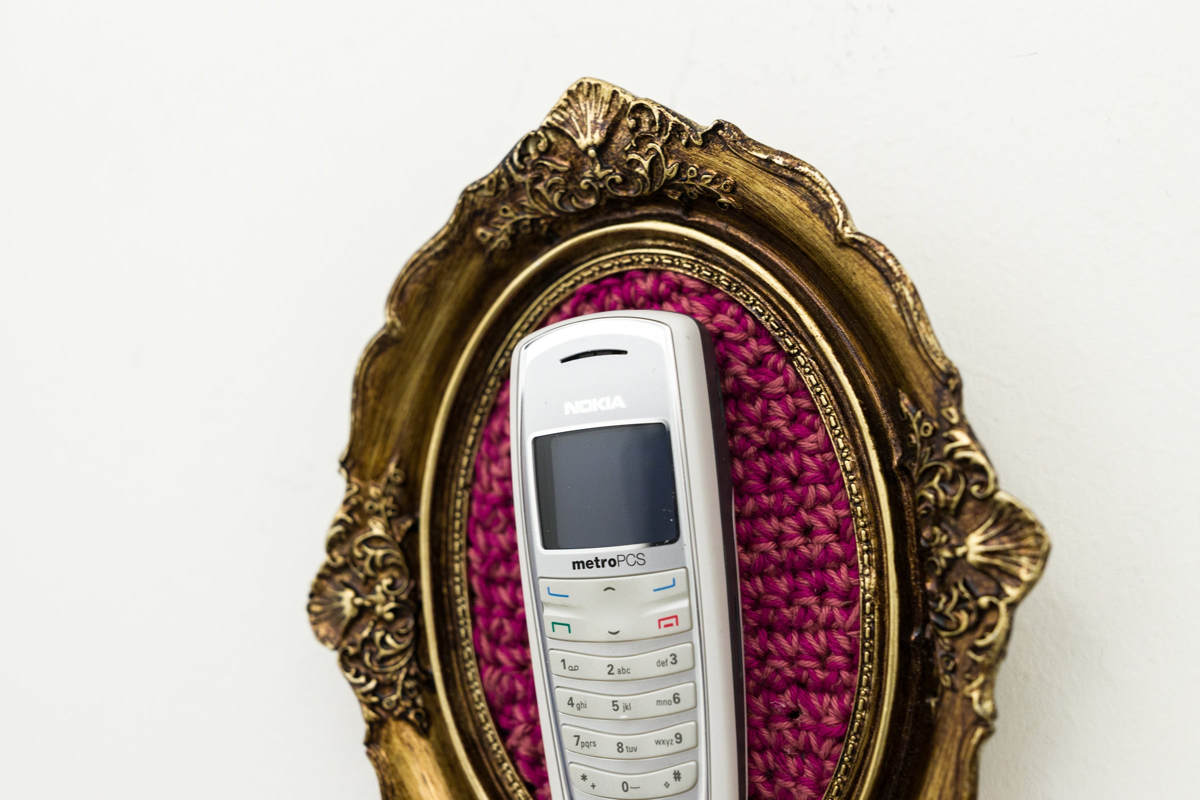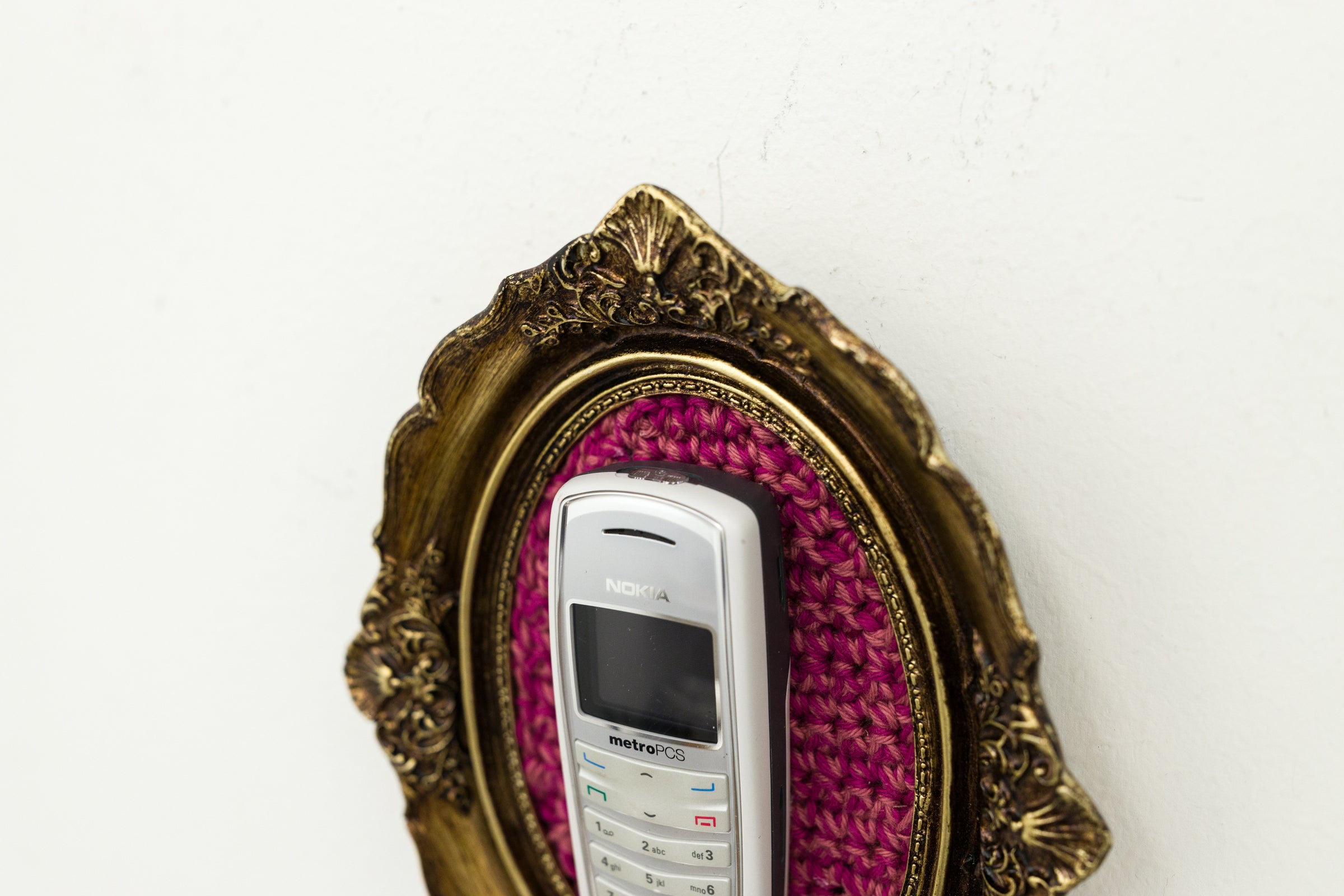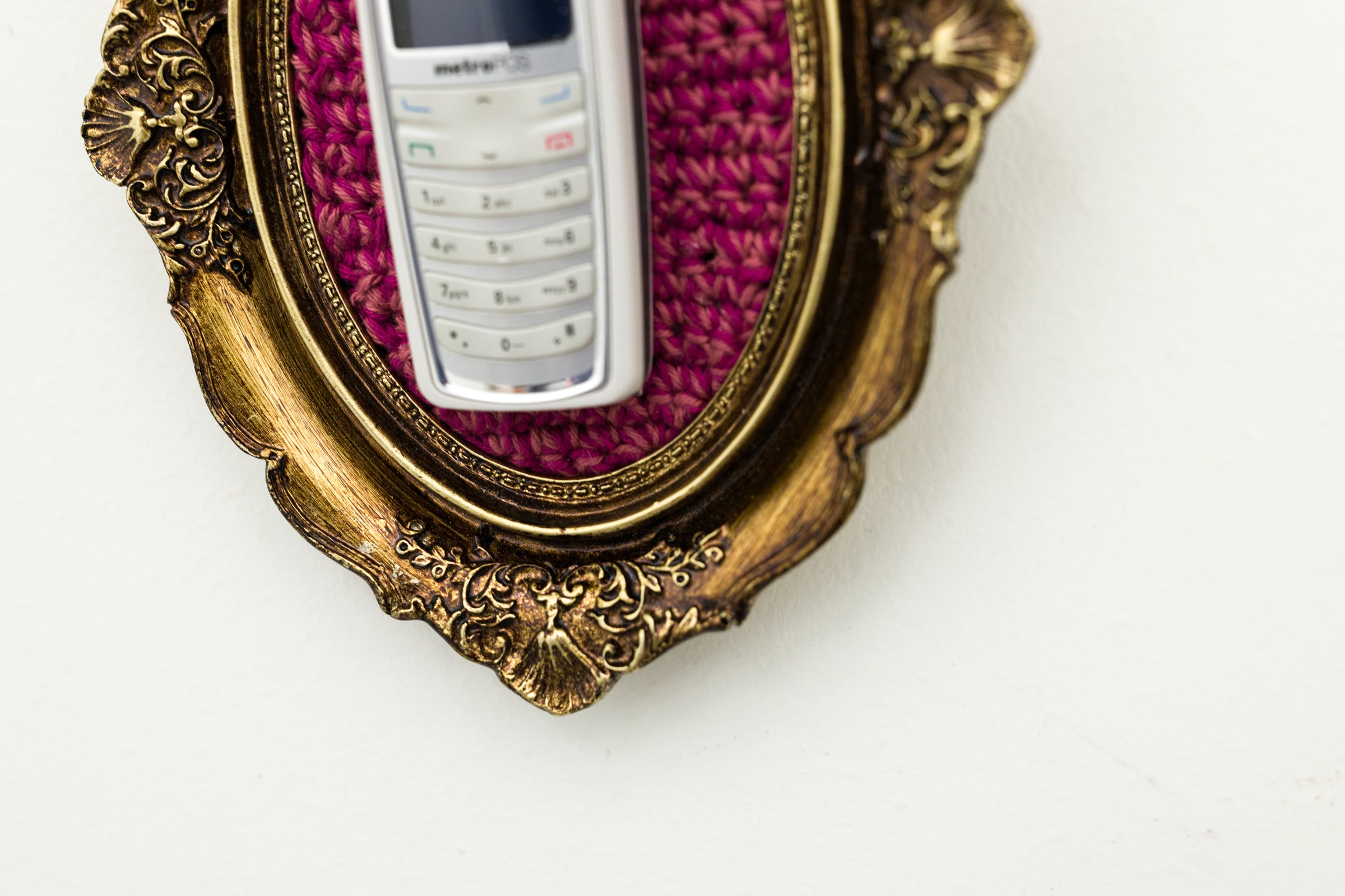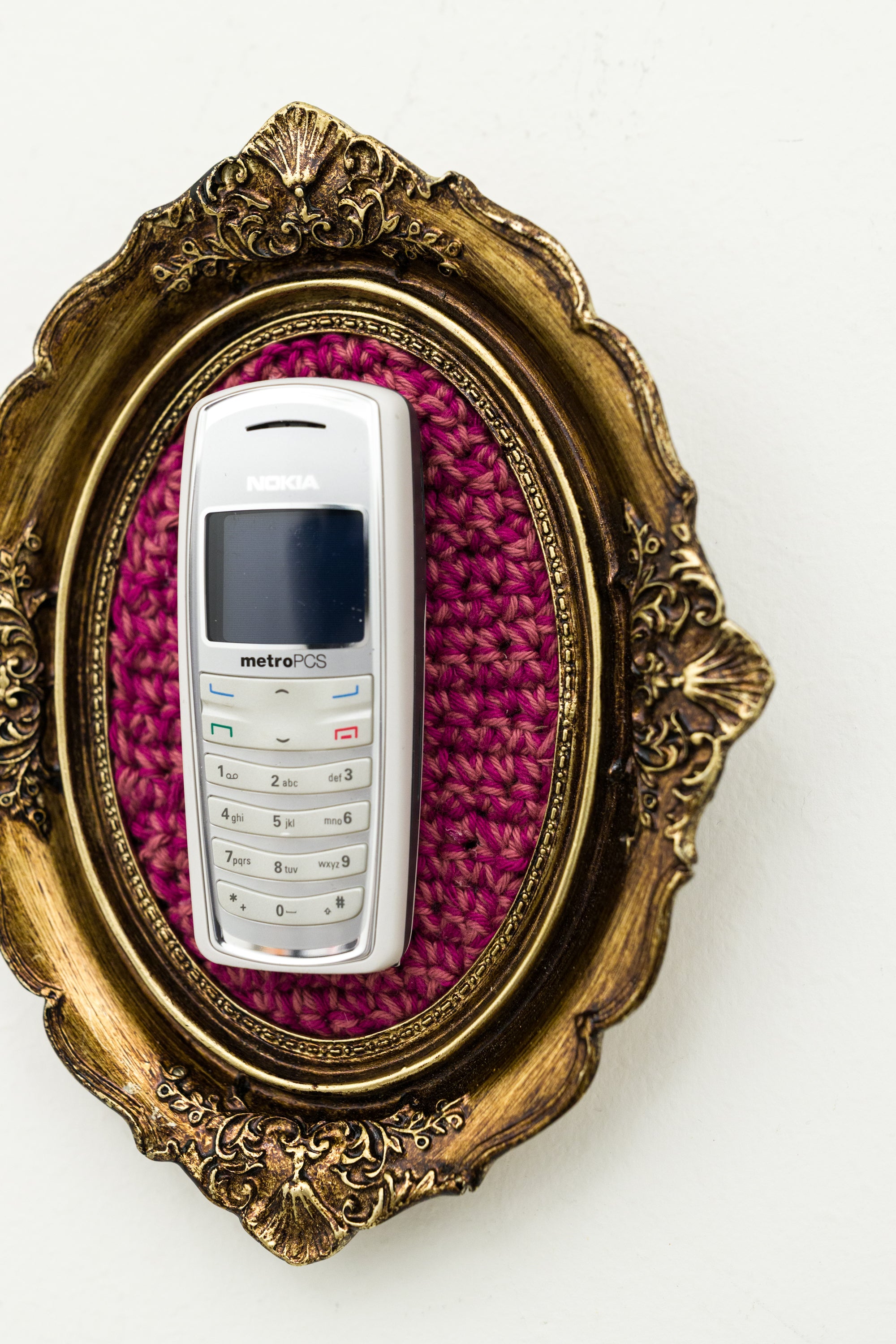 recycled cell phone mounted on crocheted acrylic in ornate frame