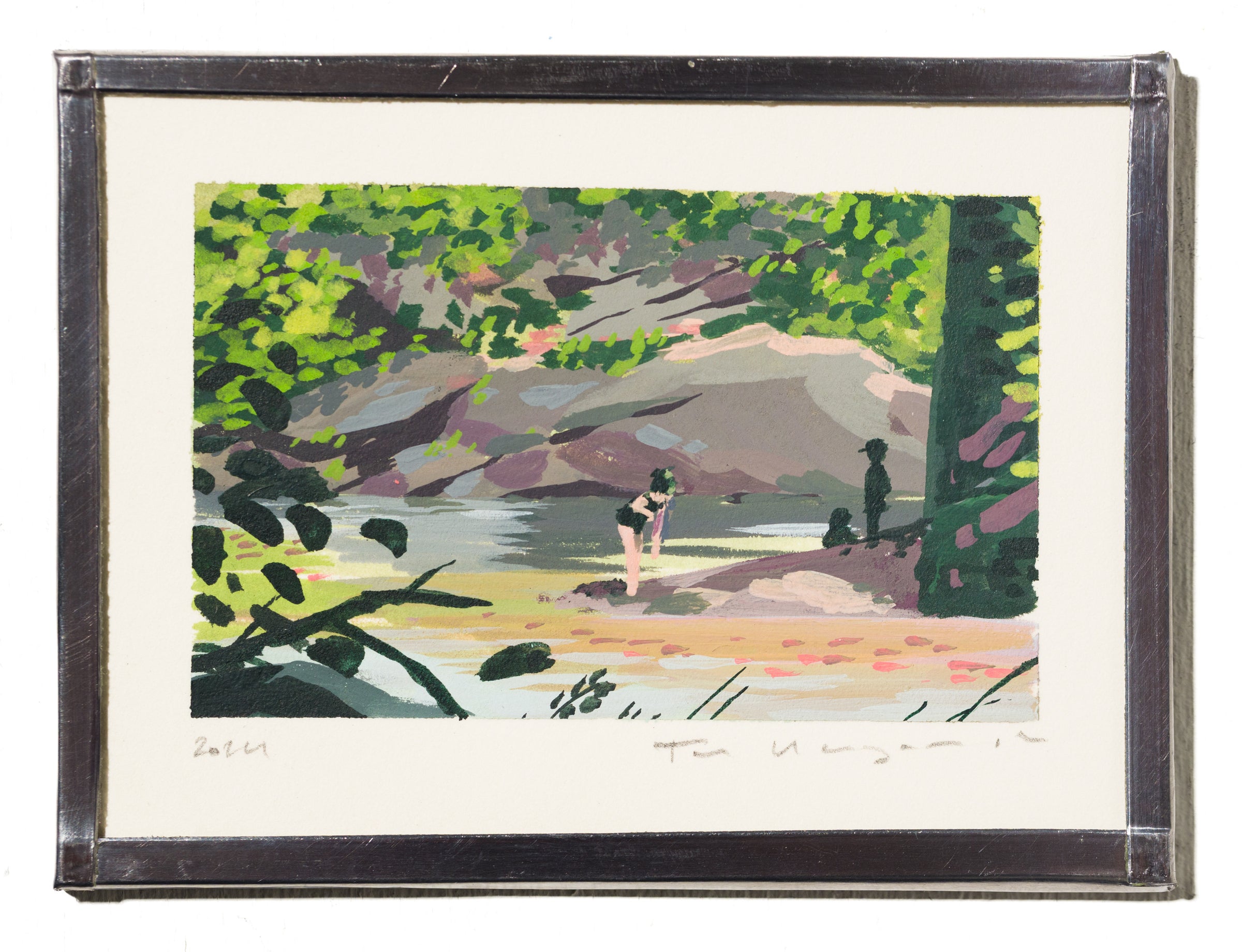 acrylic on paper, museum glass, metal tape edge, backing with hanging loop